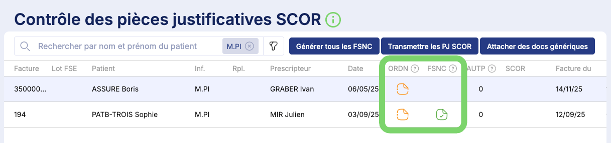 Le menu Contrôle des pièces justificatives SCOR affiche la liste des factures pour lesquelles un ou plusieurs documents manquants sont indiqués dans les colonnes ORDN, FSNC.