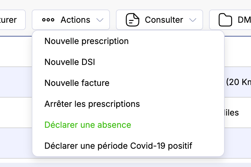 Pour déclarer l'absence d'un patient cliquez sur la fiche du patient absent. Survolez le menu Actions puis cliquez sur Déclarer une absence.