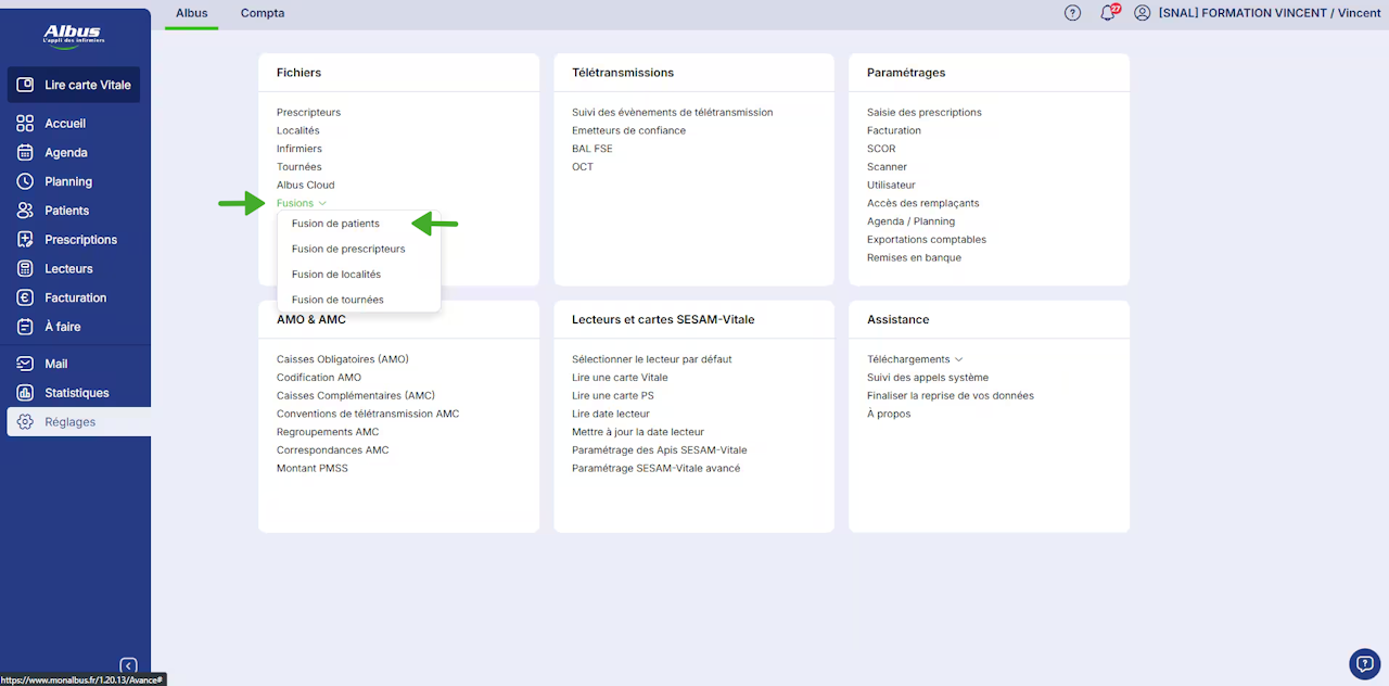 Ouvrez le menu Réglages et cliquez sur le menu Fusions puis Fusion de patients.