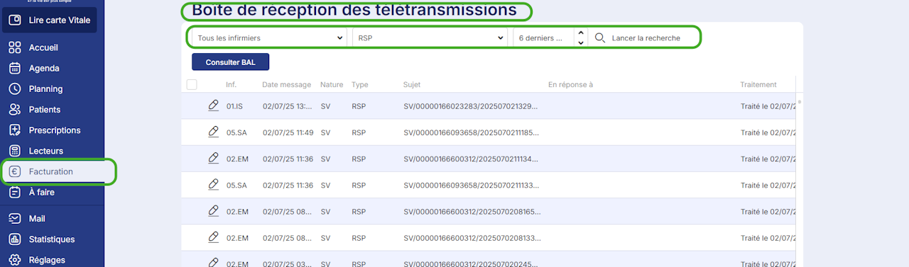 Pour imprimer les retours de télétransmissions (ou retours NOEMIE), rendez-vous dans le menu Facturation, puis Boite de réception.