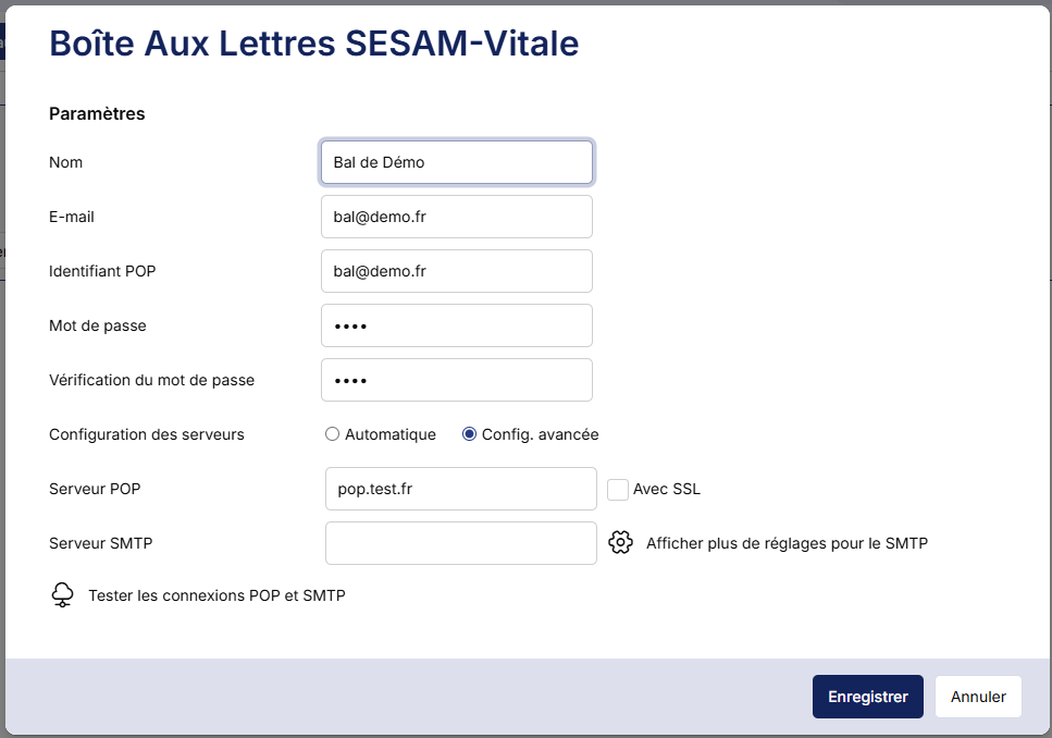 Renseignez les différents champs. Le serveur POP doit être renseigné, dans notre exemple pour une BAL LaPoste « pop.laposte.net » et cochez « Automatique ». Pour vérifier votre saisie, cliquez sur « Tester la connexion » pour vérifier que la connexion est réussie.