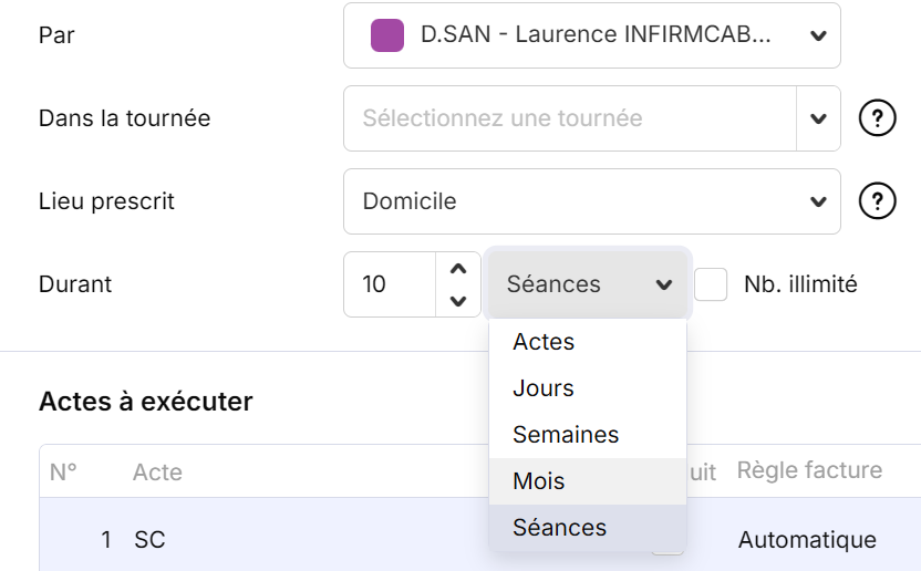 Après avoir défini le nombre de séances, un encadré Planification apparaît sous le tableau des actes à exécuter.