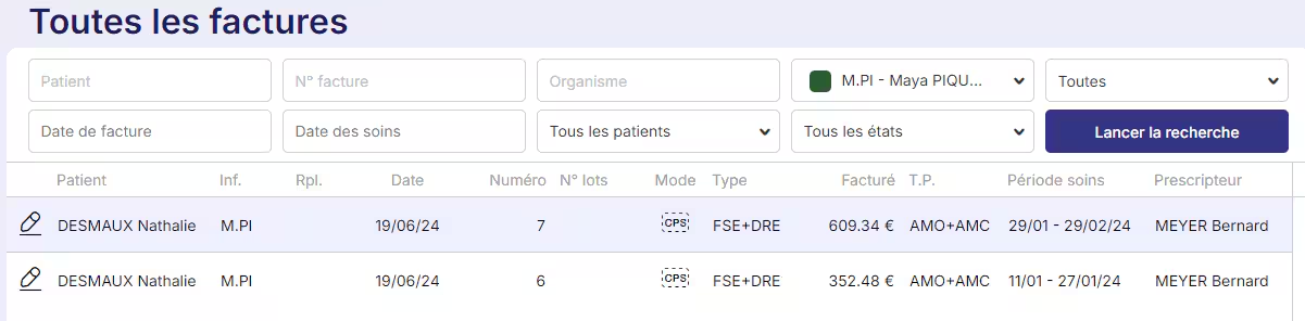 Des champs permettent de rechercher rapidement une facture en particulier