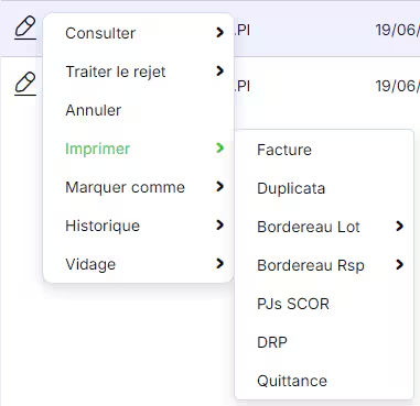 • imprimer la facture, un duplicata, un bordereau, les pièces jointes (SCOR), une demande de remboursement papier (DRP) ou une quittance