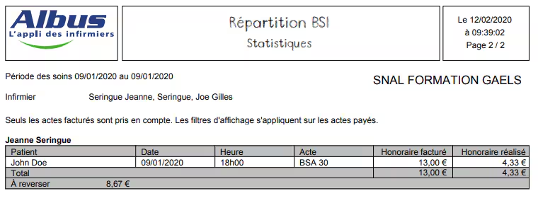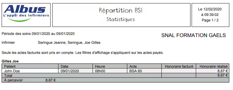Dans l'exemple suivant, le patient John Doe a été vu lors de deux rendez-vous, le matin à 08:00 pour un BSA de 60 par l'idel Gilles Joe et le soir à 18:00 pour un BSA de 30 par l'infirmier Jeanne Seringue.