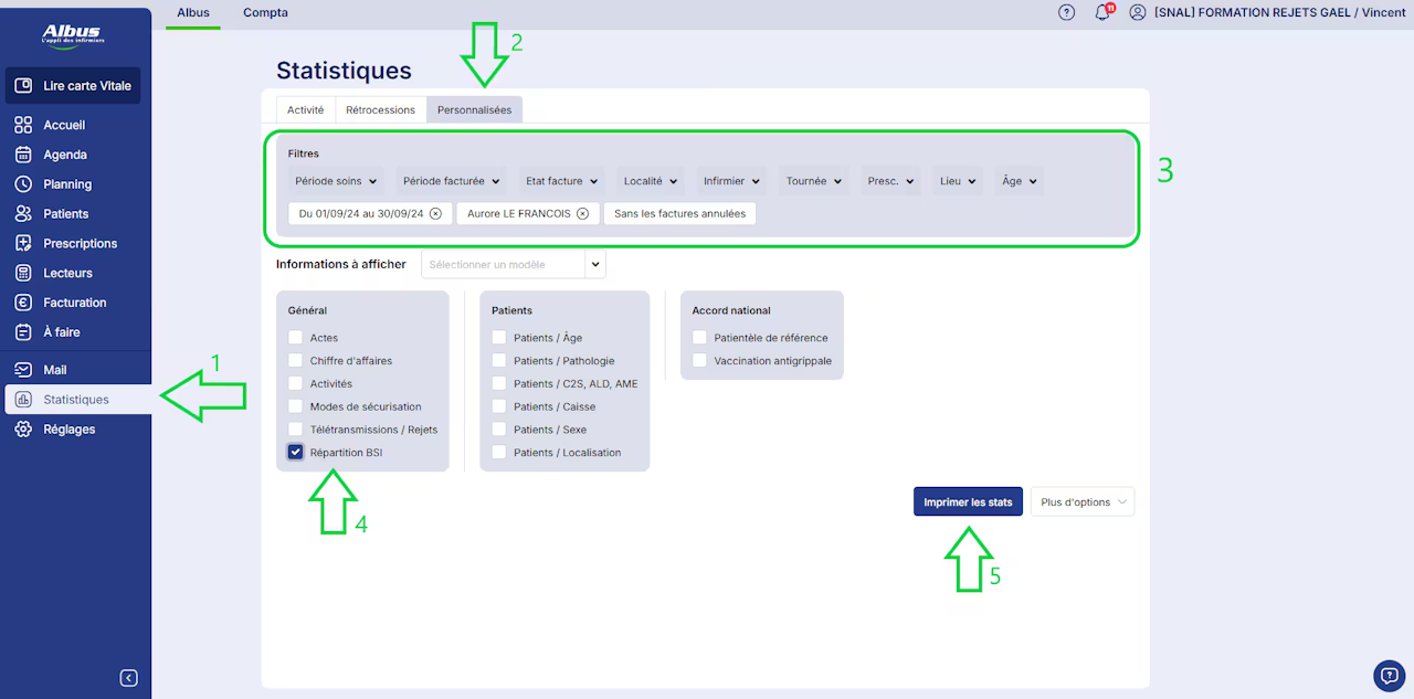 Ouvrez le menu Stats puis Personnalisées. Vérifiez et modifiez si besoin les filtres. Cochez répartition BSI et pour finir, cliquez sur imprimer les stats.