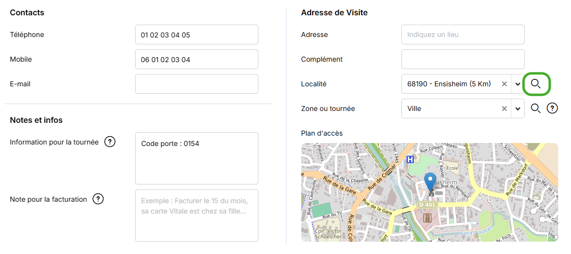 Ensuite, dans le cadre Adresse de Visite, cliquez sur la loupe sur la ligne Localité