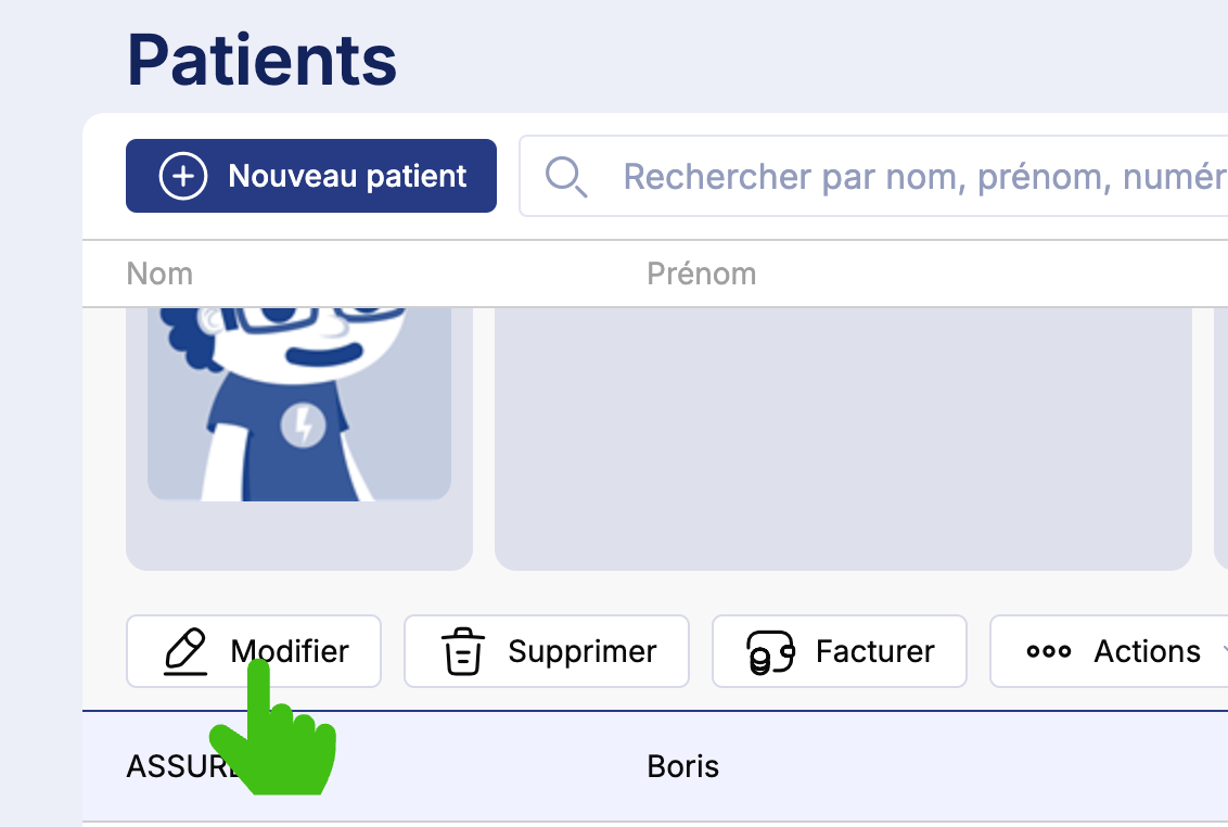 Rendez vous sur la fiche du patient concerné depuis le menu Patients puis cliquez sur le bouton Modifier.